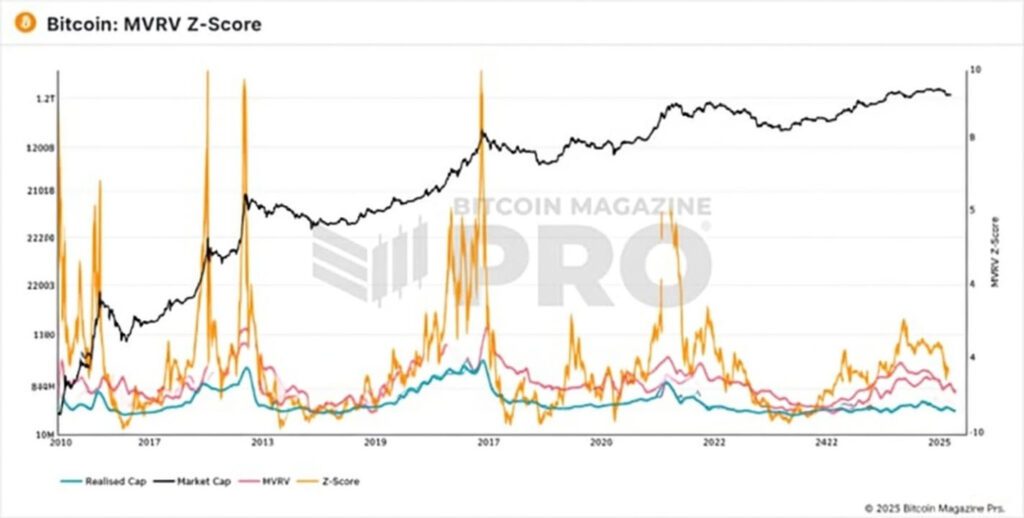 Одним із показників, який використовують для оцінювання ринкової «перегрітості» або «недооціненості», є MVRV Z-Score — метрика, що порівнює поточну ринкову капіталізацію Bitcoin із реалізованою вартістю монет, тобто загальною сумою коштів, сплаченою інвесторами за весь обсяг активу в обігу. Нещодавні дані свідчать про зниження цього індикатора до рівня близько 1,2. Таке значення розташоване ближче до нижніх зон, характерних для ведмежого ринку, ніж до пікових показників, коли MVRV Z-Score перевищував 3 у фазі активного зростання.