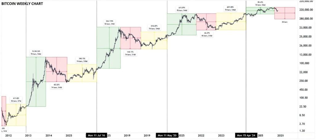 Аналіз довгострокового цінового графіка Bitcoin, який часто використовують для оцінки циклів ринку, показує, що попередні халвінги зазвичай збігалися з переходом від фази відновлення після мінімумів до періоду повноцінного бичачого тренду. Саме такий етап ринку спостерігався, починаючи з квітня минулого року, коли ціна поступово перейшла у фазу активного зростання.
