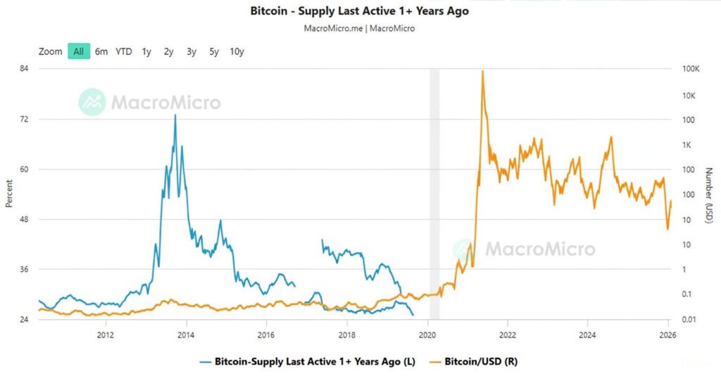 Згідно з ринковими оцінками, на початку 2024 року частка Bitcoin, що не переміщувалася щонайменше 12 місяців, перевищувала 70%, що було близько до історичних максимумів. На момент підготовки цього матеріалу показник знизився до рівня нижче 59%. Зменшення частки на 11 відсоткових пунктів виглядає поступовим, однак у перерахунку на обсяг це становить понад 2 мільйони BTC, які перейшли з категорії довгострокового утримання у «граничну» ринкову пропозицію. Оскільки цей індикатор змінюється повільно, навіть помірне зростання активності продажів серед довгострокових власників може частково нейтралізувати інституційний попит, який формується через Bitcoin ETF у 2026 році.