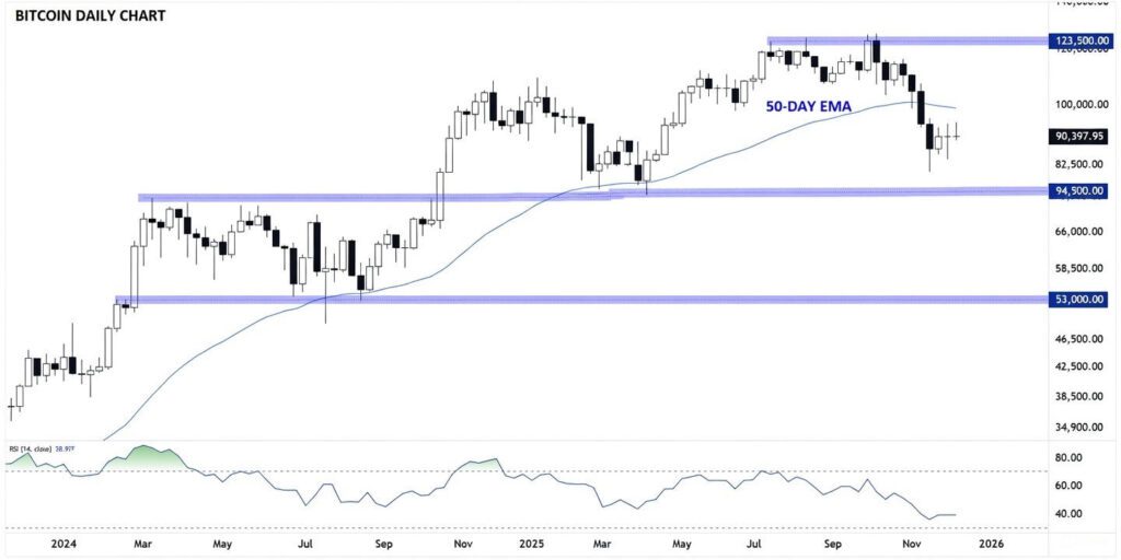 Водночас уперше за тривалий період Bitcoin опустився нижче 50-денного EMA — середньої ковзної, яку використовують для оцінки коротко- та середньострокової сили тренду. Ще одним індикатором, що вказує на охолодження ринку, є 14-тижневий RSI, який залишається нижче позначки 40. Історично такі значення частіше спостерігалися в періоди ослаблення висхідної динаміки.