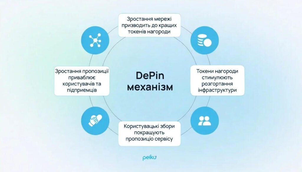 DePIN функціонує за моделлю токен-економіки. Вона поєднує дві сторони: тих, хто надає ресурси, і тих, хто ними користується. Щоб система зростала самостійно, учасники отримують цифрові винагороди за розгортання обладнання, підтримку його роботи, передачу даних і надання послуг у фізичному або цифровому середовищі. Токени стають внутрішнім механізмом мотивації, розрахунків і підтвердження корисної дії.