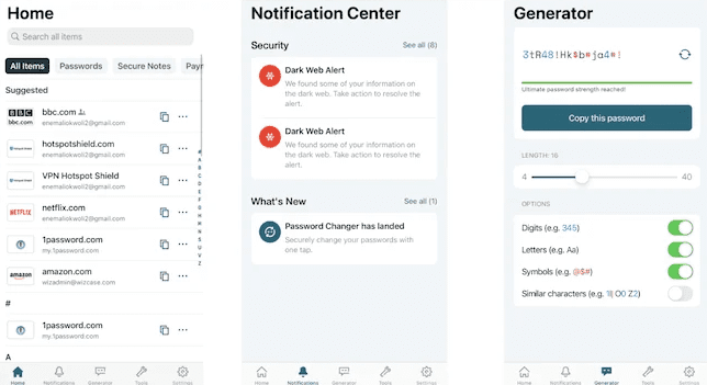 Dashlane пропонує генератор складних паролів до 40 символів, інструмент Безпечні нотатки для захисту особистих даних і файлів, а також вбудований VPN для безпечного користування публічними мережами. Моніторинг темної мережі дозволяє дізнатися, чи не зламано ваш обліковий запис, і оперативно змінити паролі.
