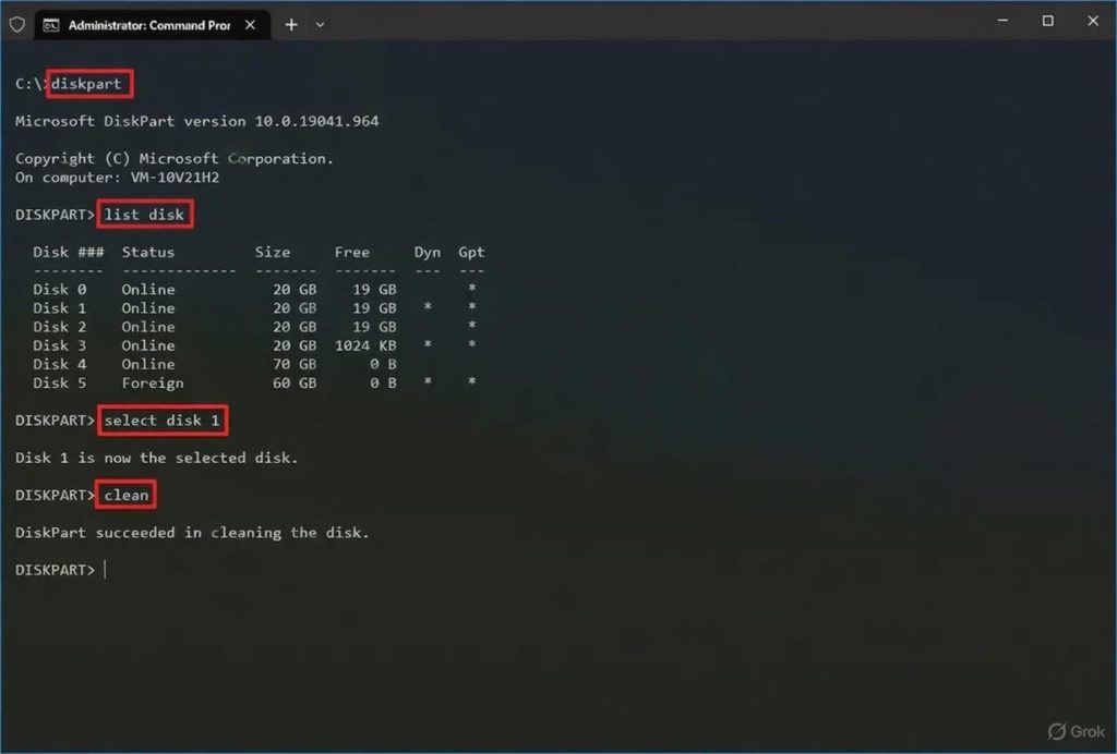 ❗ Попередження: команда clean видаляє всі дані, розділи та інформацію про диск. Після цього накопичувач відображатиметься як «Невідомий» і буде неініціалізованим.