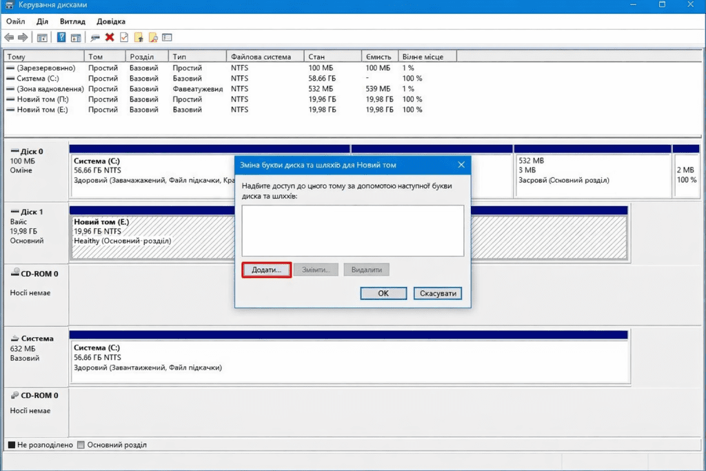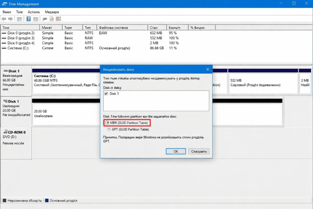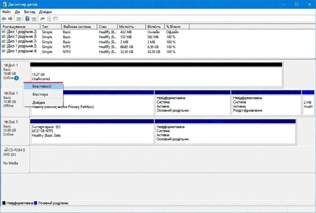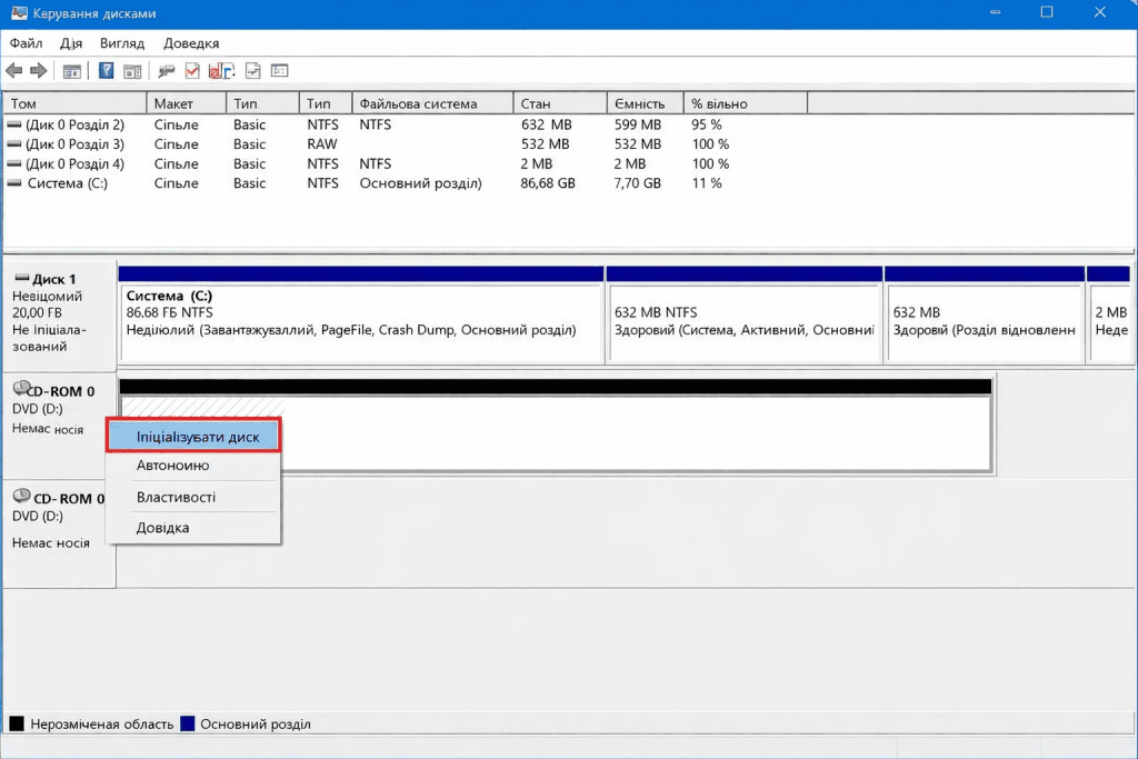 Крім того, диск може бути неініціалізованим або не відформатованим, через що він не відображається у Провіднику. У таких випадках система бачить пристрій, але не може показати його як доступний розділ для роботи з файлами.