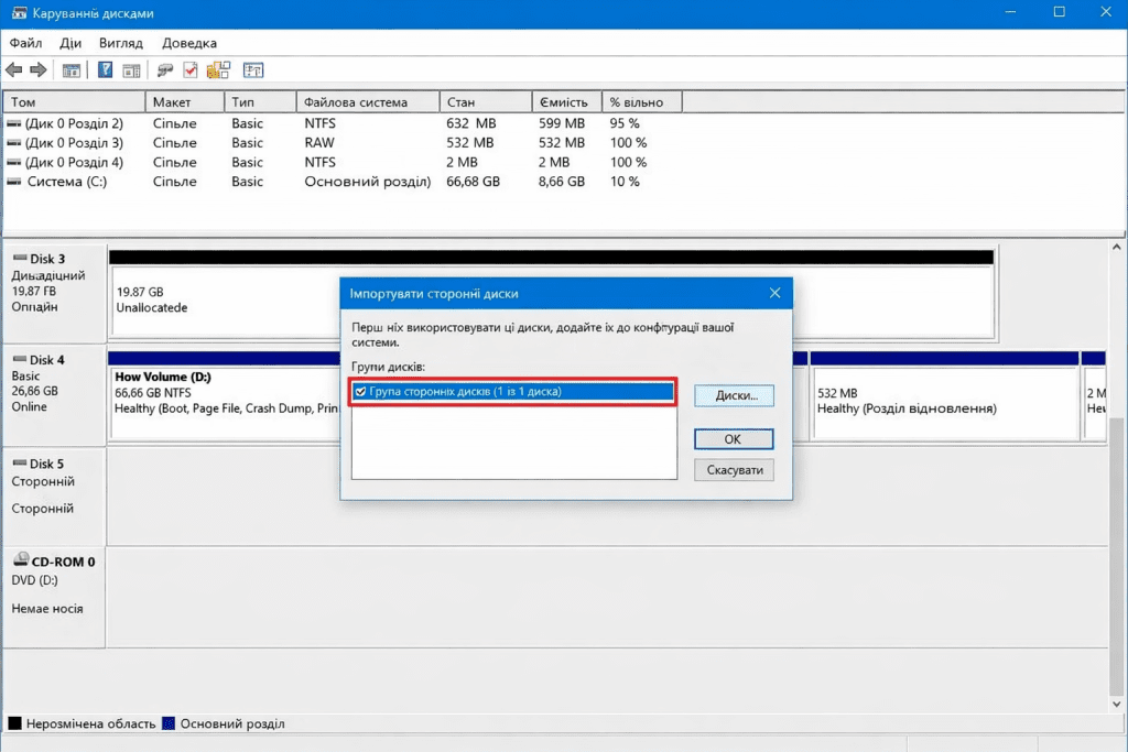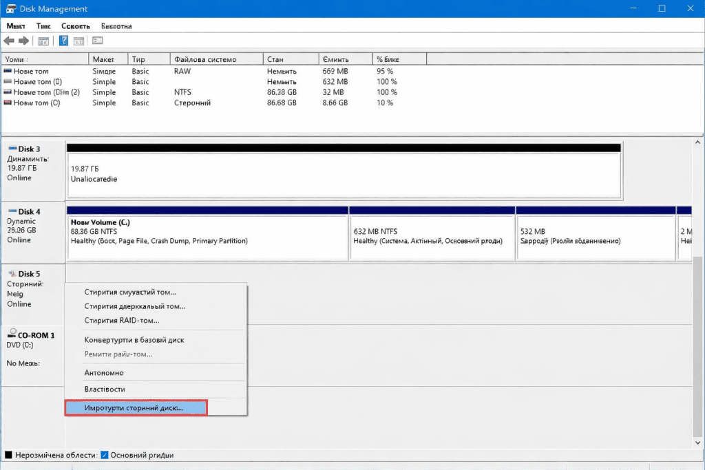 Якщо диск було налаштовано як динамічний на іншому комп’ютері, на новому пристрої він відображатиметься як сторонній (foreign) диск. У такому випадку потрібно імпортувати його через консоль «Керування дисками». Цей процес дозволяє отримати доступ до даних без їх знищення, але за можливості все одно рекомендується створити резервну копію файлів.