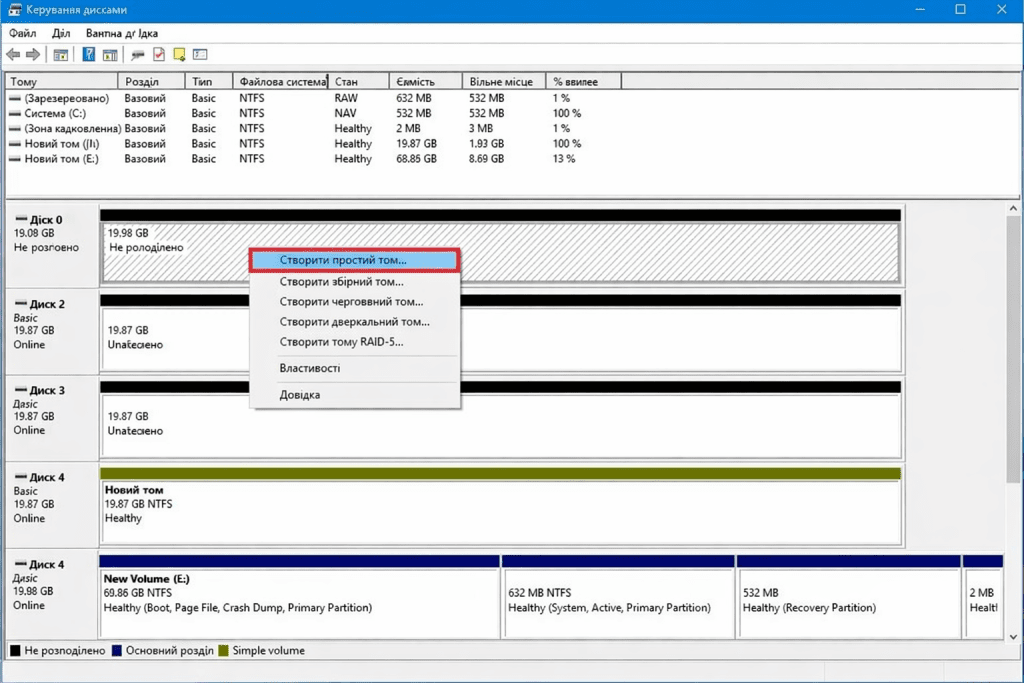 - Клацніть правою кнопкою миші по розділу без літери диска та виберіть пункт «Створити простий том» (New Simple Volume).