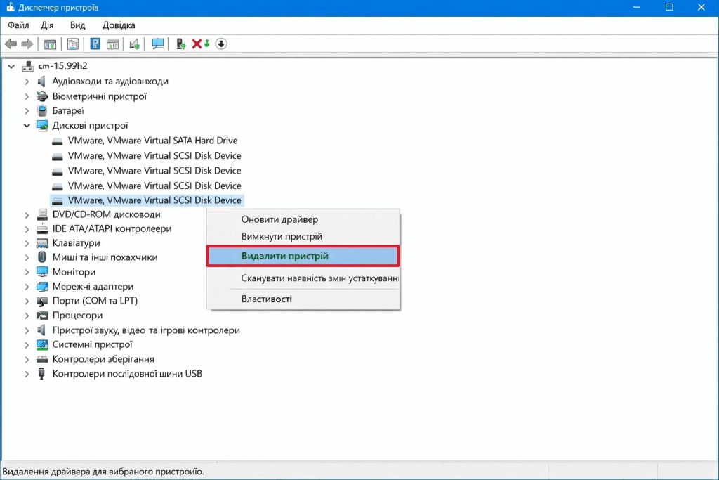 - Клацніть правою кнопкою миші по потрібному жорсткому диску та виберіть опцію «Видалити пристрій».