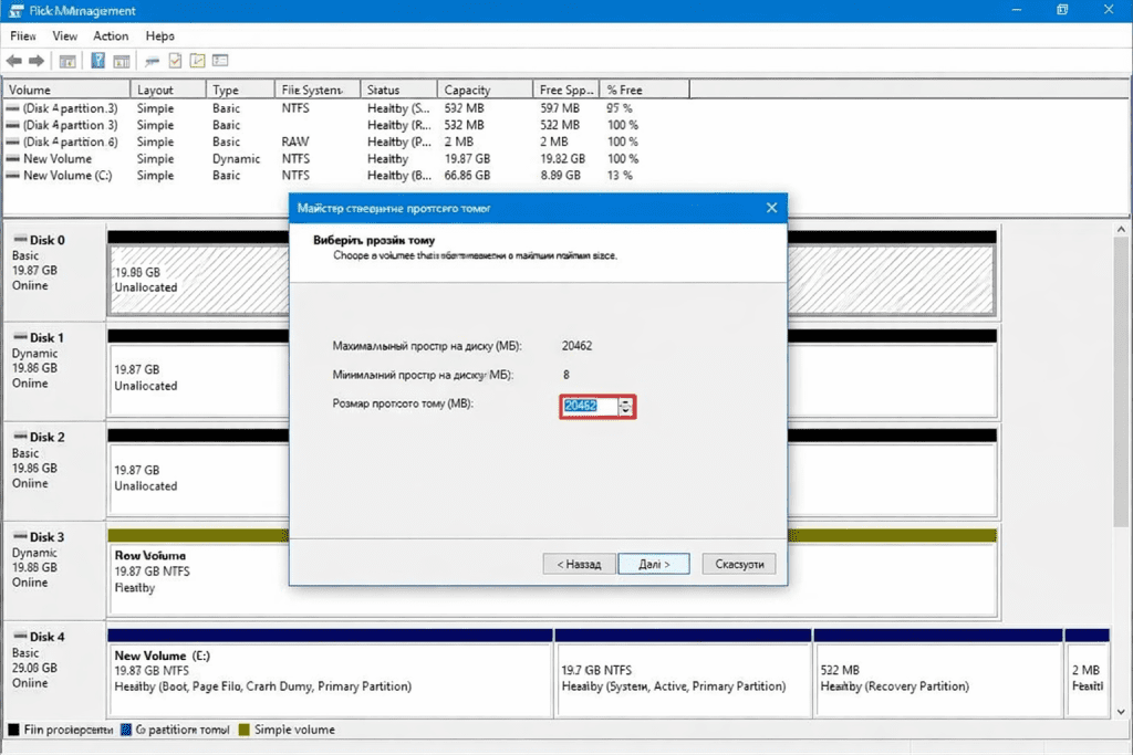 На наступному кроці знову натисніть «Далі», щоб використати весь доступний простір для розділу, або вкажіть потрібний розмір у полі «Розмір простого тому (МБ)».