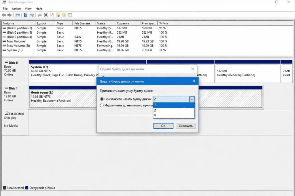 Якщо накопичувач перебуває в режимі Online та ініціалізований, але не має відформатованого розділу, його необхідно налаштувати вручну. Для цього скористайтеся інструментом Керування дисками (Disk Management), щоб створити розділ і призначити літеру диска.