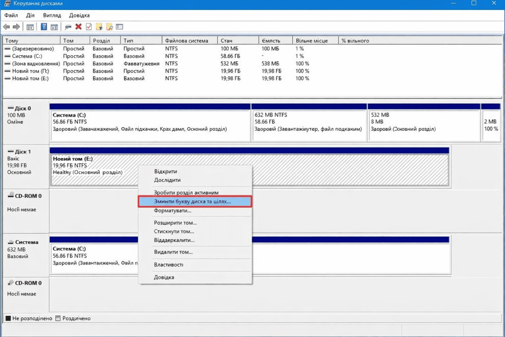 Клацніть правою кнопкою миші по розділу диска, який не має літери, та виберіть «Змінити літеру диска або шлях до диска».