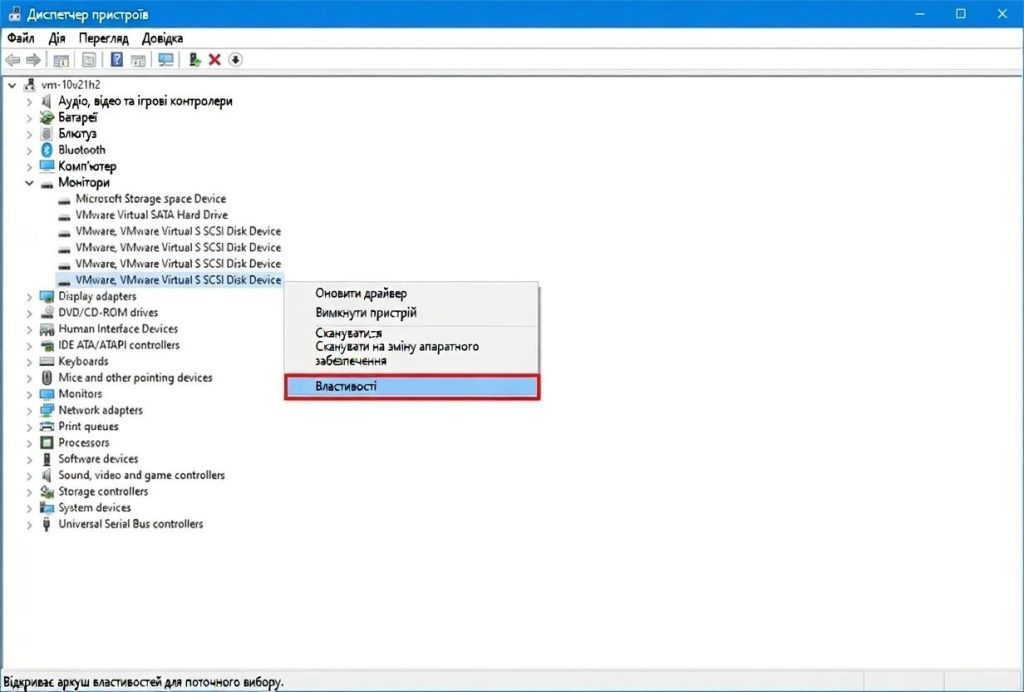 - Клацніть правою кнопкою миші на потрібному жорсткому диску та оберіть Властивості для подальшої налаштування.