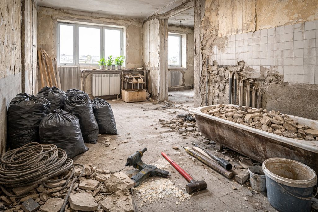 Перший етап — це повне звільнення приміщення. Необхідно утилізувати старі меблі, демонтувати підлогові покриття, зняти штукатурку, плитку та інші оздоблювальні матеріали. Окрему увагу слід приділити демонтажу старої електропроводки, водопровідних і каналізаційних труб, а також застарілого сантехнічного обладнання, яке не відповідає сучасним вимогам безпеки.