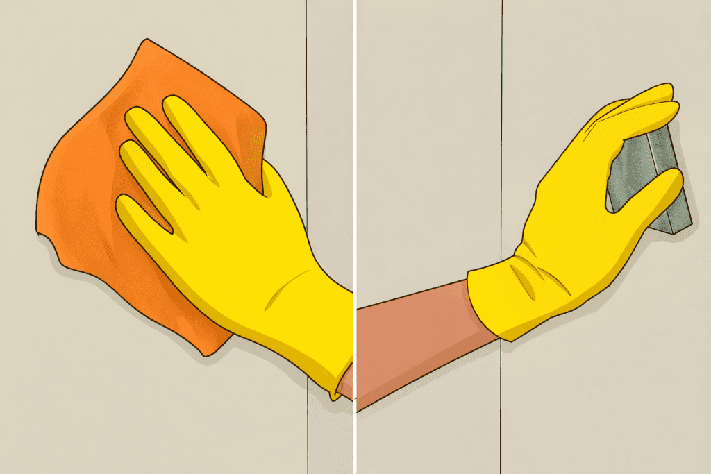 Після сухого очищення необхідно протерти стіну чистою губкою з водою, щоб остаточно прибрати залишки пилу та дрібного бруду. Занурте губку у відро з чистою водою, добре відіжміть її й акуратно пройдіться по поверхні стіни. Працюйте поступово, ділянка за ділянкою, доки не обробите всю площу.