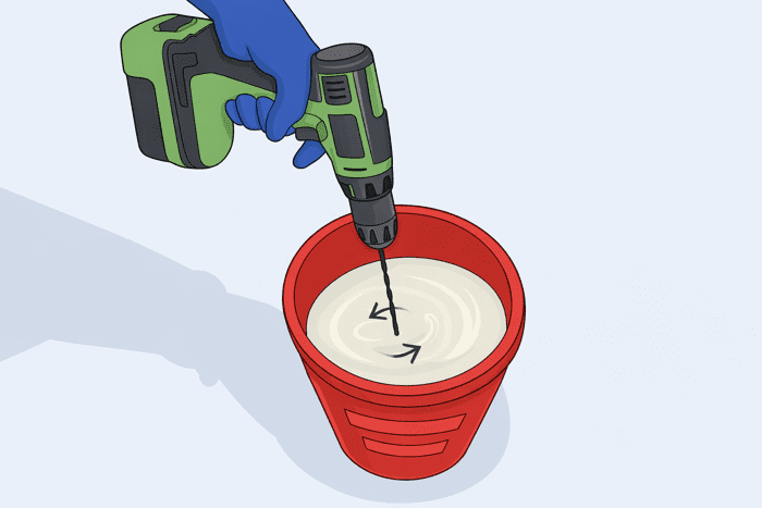 Перемішуйте шпаклівку доти, доки вона не стане повністю однорідною та гладкою, без грудок і сухих включень. Найшвидший і найзручніший спосіб — використовувати міксерну насадку на дриль, увімкнувши низькі оберти. Це дозволяє рівномірно змішати суміш і не перенаситити її повітрям. За відсутності електроінструмента можна скористатися дерев’яною паличкою або шпателем, хоча це займе трохи більше часу.